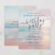 Cheap Affordable BUDGET Paper Flier Sheet Invitation with an aesthetic pink and teal aqua blue ocean side beach sunset with rose gold palm tree leaf and overlay background on a summer beach theme birthday invitation. Wording can be changed to work for any age birthday or celebration, and the back has space for optional attire, directions, or parking information.