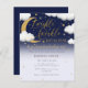 This is an adorable budget friendly baby shower invitation based on the “Twinkle twinkle little star” nursery rhyme. The design features a cute handwritten script calligraphy font, a golden moon with gold stars and cute fluffy clouds in a twinkling starry night sky. This gender neutral invitation would be perfect for any mother-to-be looking to celebrate the arrival of a twinkling little star.