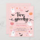 Budget two spooky pink Halloween cute ghost 2nd birthday party invitation. Modern Halloween-themed design for a spooky party! This birthday invitation features spider's webs, ghosts, pumpkins, bats, spiders, leaves, corns, stars and daisies. This invite is great for little girls!