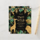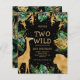Celebrate your little wild thing's second birthday with this jungle safari themed invitation, featuring gold faux foil animals (giraffe, lion and monkeys), gold and green jungle foliage, and a sprinkling of gold confetti. Add your child's name and party details in gold coloured text on a black background. A coordinating jungle foliage pattern in green and gold on a black background decorates the back of the card.