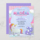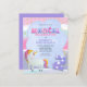 Unicorn magical 3rd Birthday Party Invitation. A budget price SMALLER 4.5” x 5.6” alternative. Available in a SEMI-GLOSS 110 lb CARD STOCK which is the default option (thicker for invitations), OR a SATIN FINISH 80 lb THINNER PAPER STOCK (ideal for enclosures). Envelopes are an optional extra and are slightly larger than the card size. A mystical cute unicorn design for your daughter’s 3rd birthday, with typography Magical in a set style in shades of pink and lilac with a pattern of stars and a unicorn symbol on the C. The rest of the text you can easily personalise. The text sit’s upon a blue cloud shape and in the background a stripe pattern in lilac, blues and shades of pink with gold confetti and a coordinating lilac background on the back.