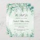 A green watercolored background decorated with eucalyptus greenery, forest ferns. Personalise and your name and ceremony details.