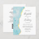 The left-hand edge of this elegant modern wedding invitation features an aqua blue watercolor agate border trimmed with faux gold foil. The customizable text combines handwriting, copperplate and italic fonts in charcoal gray on a white background. The reverse side provides space for wedding details on a solid white background, along with a QR code guests can scan to visit your website and RSVP, which saves the cost of printing and mailing separate RSVP cards.