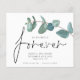 A value for money BUDGET alternative on a smaller size 4.5 x 5.6” semi-gloss 110lbs weight, which is of similar thickness to a postcard (however is not suitable to use as a postcard.). PLEASE NOTE there is ONE invite per sheet. We Decided on Forever EucalyptUs Save Date Forever in an informal set script.The rest of the text you can easily personalise. Text and white background colours can be changed if you wish via the customise further option.