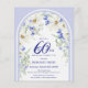 Elegant 60th Birthday Party invitation template features a Boho floral arch made from white daisies and blue wildflowers. This item is part of the Boho Arch Blue and White Floral Collection.