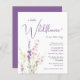 An elegant budget-friendly baby girl shower invitation that features "a little wildflower is on her way" in a mix of modern soft grey typography and a stylish purple script, and a boho-inspired watercolor bouquet of dainty purple, pink and yellow wildflowers.