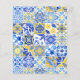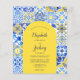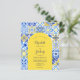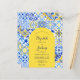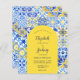 This rustic design features a background pattern of blue, yellow and white watercolor Portuguese tiles, or azulejos. Personalise it with the names of the bride and groom in blue calligraphy script and the remaining text in a combination of sans serif, copperplate and italics on a yellow arch shape. A matching tile pattern appears on the reverse side.
