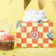 A pattern drawing of budgies in cute manga style with orange chequered pattern for the background. Featuring many budgie mutation colours: green, yellow, white, blue, violet and mauve.
