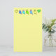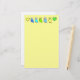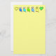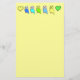 Yellow writing paper with cartoonish parakeets and green and yellow hearts