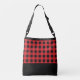 This cross-body tote bag is shown in the Christmas favourite black and red buffalo plaid that can be used in year round. Black handle straps, black top trim and black bottom. Medium size shown.
