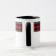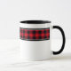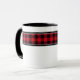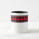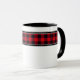 This ceramic coffee mug is shown with a cute black and red buffalo plaid print and two black accent stripes.