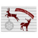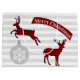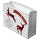 Masculine Christmas gift bag done in a pale grey and white striped background, with red and black buffalo plaid deer cut outs, a grey and white snowflake ornament and a red and white banner reading Merry Christmas. Personalise the text to read what you want.