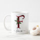 Black and Red Buffalo Plaid F Monogram Xmas Coffee Mug featuring a cute A initial letter with a buffalo plaid pattern and mistletoe watercolor element. The custom name template under the F monogram is in a swirly handwritten calligraphy font with flourishes. Give a thoughtful personalised Christmas mug as a winter holiday gift or stocking stuffer. For a different monogram letter check out the "Other products from this collection" section below.