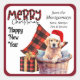 This Holiday sticker features a cute Golden Retriever puppy wearing a red and white Santa hat. The dog sits in a woven wicker basket. Behind the pup is a red and black buffalo plaid pillow, and a matching gift package sits beside the basket. Buffalo plaid typography pairs with black script to say "MERRY Christmas", with "Happy New Year" below that. Your custom signature is in two easy to change text fields. Perfect for your Holiday correspondence.