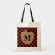 A bag for teachers featuring an illustration of a burlap apple over a red and black heritage (buffalo) plaid background. Personalise the initial.