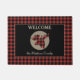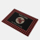 A buffalo plaid silhouette moose head is at the center of a tan circle on this attractive door mat. The circle is placed on a black background, which is framed with a matching red and black buffalo plaid border. Your custom text is in matching tan above and below the circle and moose image. Perfect for a cabin, woodland home, but comfortable at home in the city, too!