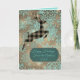 A brown buffalo plaid reindeer jumping in a sea of blue teal snowflakes on a brown backdrop creating whimsical fantasy christmas cheer including a blue teal banner where you can personalise your card.