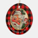A retro image of traditional Santa Claus with his red fur cap, rosy checks, twinkling eyes and white beard is at the centre of this Holiday ornament. Santa wears a sprig of holly and red berries on his cap, and is holding a red and white striped candy cane The custom text in white at the bottom says "Happy Holidays from the (Name)"on a red and black buffalo plaid circle border. The back has the same image and border with another text field for you to customise.
