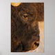 Close up photograph of a Buffalo’s face. Taken at Antelope Island State Park in Utah early in the morning. The blue morning sky can be seen reflected in his eye.