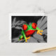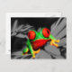 Photograph of a bright, shiny green frog with a red belly and huge red bulgy eyes on a black and white background of leaves.