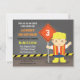 A construction theme birthday party offers lots of fun for birthday boys who love construction toys and machines because they are so many party ideas to work with on this theme! This construction theme invitation has a cute boy in construction outfit made up of safety hat, orange vest and yellow boots. He is holding on to an orange sign which you can personalise with the child's age. A yellow and black slanted stripes pattern which is used for construction zones and barriers. Children guests are going to be so happy and excited to receive this invitation!
