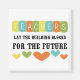 Multicolor text and hearts design reads "Teachers Lay The Building Blocks For The Future" on teacher inspirational T-shirts, mugs, bags, buttons, stickers, key chains, cards, and other items great for teachers, education professionals, or anyone who values teachers and education!