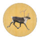 A bull caribou, or reindeer, superimposed on a background colour suggesting brain-tanned leather. You may choose another background colour. The caribou (Rangifer tarandus), known as the reindeer outside of North America, is a deer of the Arctic and Subarctic. While overall widespread and numerous, some subspecies are rare and one has gone extinct. The Inuit word tuktu means - deer that never stops moving. Caribou are always on the move, going north to calve, heading for the winter grounds, and south in the summer. Caribou considerably in colour and size. Uniquely among deer, both genders grow antlers, though these are larger in the males and there are a few populations where females lack them completely. Caribou hunting and herding of semi-domesticated reindeer (for meat, hides, antlers, milk and transportation) are important to several Arctic and Subarctic people. Even far outside its range, the caribou/reindeer is well known due to the myth, probably originating in early 19th century America, in which Santa Claus's sleigh is pulled by flying reindeer, a popular secular element of Christmas. In actual Lapland, reindeer would pull a pulk. Distribution and habitat The caribou/reindeer is a widespread and numerous species in the northern Holarctic, being present in both tundra and taiga (boreal forest). It was originally was found in Scandinavia, eastern Europe, Russia, Mongolia, and northern China north of the 50th latitude. In North America, it was found in Canada, Alaska (USA), and the northern conterminous USA from Washington to Maine. In the 19th century, it was apparently still present in southern Idaho. It also occurred naturally on Sakhalin, Greenland, and probably even in historical times in Ireland. During the late Pleistocene era, reindeer were found as far south as Nevada and Tennessee in North America and Spain in Europe.Today, then species has disappeared from many areas within this large historical range, especially from the southern parts, where it vanished almost everywhere. Large populations are still found in Norway, the Markku region of Finland, Sweden, Siberia, Greenland, Alaska, and Canada. Domesticated reindeer are mostly found in northern Fennoscandia and Russia, with a herd of approximately 150-170 reindeer living around the Cairngorms region in Scotland. The last remaining wild tundra reindeer in Europe are found in portions of southern Norway. A few reindeer from Norway were introduced to the South Atlantic island of South Georgia in the beginning of the 20th century. Today, there are two distinct herds still thriving there, permanently separated by glaciers. Their total numbers are no more than a few thousand. The flag and the coat of arms of the territory contain an image of a reindeer. Around 4000 reindeer have been introduced into the French sub-Antarctic archipelago of Kerguelen Islands. East Iceland has a small herd of about 2500–3000 animals. Caribou and reindeer numbers have fluctuated historically, but many herds are in decline across their range. This global decline is linked to climate change for northern, migratory caribou and reindeer herds and industrial disturbance of caribou habitat for sedentary, non-migratory herds. Fur Fur colour varies considerably, both individually, and depending on season and subspecies. Northern populations, which usually are relatively small, are whiter, while southern populations, which typically are relatively large, are darker. This can be seen well in North America, where the northermost subspecies, the Peary Caribou, is the whitest and smallest subspecies of the continent, while the southermost subspecies, the Woodland Caribou, is the darkest and largest. The coat has two layers of fur, a dense woolly undercoat and longer-haired overcoat consisting of hollow, air-filled hairs. Antlers Reindeer antlers grow again each year under a layer of fur called velvet. In most populations both sexes grow antlers, which (in the Scandinavian variety) for old males fall off in December, for young males in the early spring, and for females in the summer. The antlers typically have two separate groups of points, a lower and upper. Domesticated reindeer are shorter-legged and heavier than their wild counterparts. There is considerable subspecific variation in the size of the antlers (e.g., rather small and spindly in the northernmost subspecies), but in some subspecies the bull reindeer's antlers are the second largest of any extant deer, after the moose, and can range up to 39 inches (100 cm) in width and 53 inches (135 cm) in beam length. They have the largest antlers relative to body size among deer.Antler size plays a significant role in establishing group hierarchy. Nose and hooves Reindeer have specialised noses featuring nasal turbinate bones that dramatically increase the surface area within the nostrils. Incoming cold air is warmed by the animal's body heat before entering the lungs, and water is condensed from the expired air and captured before the deer's breath is exhaled, used to moisten dry incoming air and possibly absorbed into the blood through the mucous membranes. Reindeer hooves adapt to the season: in the summer, when the tundra is soft and wet, the footpads become sponge-like and provide extra traction. In the winter, the pads shrink and tighten, exposing the rim of the hoof, which cuts into the ice and crusted snow to keep it from slipping. This also enables them to dig down (an activity known as "cratering") through the snow to their favourite food, a lichen known as reindeer moss. The knees of many species of reindeer are adapted to produce a clicking sound as they walk. Diet Reindeer are ruminants, having a four-chambered stomach. They rely primarily on lichens in winter, especially reindeer moss. However, they also eat the leaves of willows and birches, as well as sedges and grasses. There is some evidence to suggest that on occasion, they will also feed on lemmings, arctic char, and bird eggs. Reindeer he