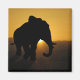 A magnificent bull elephant is starkly silhouetted against the fires of the setting sun.