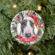 This sophisticated watercolor of a multi-colour Bull Terrier dog ceramic Christmas ornament features the terrier in a Santa hat, surrounded by holiday greenery, pinecones and berries, with a red banner with your pet's name (or change to Merry Christmas). You can fully personalise this design by changing the greeting and year on the back in an elegant font. This is a stylish custom Christmas ornament is perfect for Bull Terrier fans, terrier owners, bully breed lovers, dog lovers, and pet lovers.
