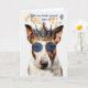 This birthday card features a bull terrier dog wearing a crown and round sunglasses. The dog is looking directly at the viewer with a serious expression. The card is white with a gold and blue design. The text on the card reads, "You are hereby crowned King for a Day." There are two balloons in the top right corner, one gold and one blue. The overall tone of the card is playful and celebratory. It would be a fun and unique card to give to the dog dad or dogfather for their birthday.