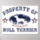 The Bull Terrier's most recognisable feature is its head, described as 'egg shaped' when viewed from the front, almost flat at the top, with a Roman muzzle sloping evenly down to the end of the nose with no stop. The unique triangle-shaped eyes are small, dark, and deep-set. The body is full and round, while the shoulders are robust and muscular and the tail is carried horizontally. It walks with a jaunty gait, and is popularly known as the 'gladiator of the canine race'. Though this breed was once a fierce gladiator, it is much gentler today. A Bull Terrier might have a preventive effect and it will certainly defend its owner in a truly critical situation. Bull Terriers are known to be courageous, scrappy, fun-loving, active, clownish and fearless. The Bull Terrier is a loyal and polite dog. They become very attached to their owners.