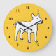 This decorative wall clock features a simple and modern cartoon illustration of a white Bull Terrier dog on a vibrant orange background. The minimalist design adds a touch of whimsy to any room while still remaining stylish and elegant. Perfect for Bull Terrier enthusiasts or anyone looking for a unique and eye-catching wall clock.