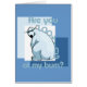 A cute polar bear with sunglasses. He is sitting facing away but with his head turned forward with a silly grin. the caption says "Are you looking at my bum?" bum looker....... cheeky monkey!