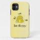 A shaded yellow background featuring a busy bees buzzing around their beehive. The saying bee happy and be changed as desired.