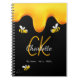 A stylish black background and happy smiling bumble bees. Decorated with sweet, golden honey dripping. Personalise and add your name, monogram initials, and a title. Golden and white letters. The name is written with a hand lettered style script.