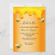 Elegant, fun, summer bridal shower invitation. A faux gold metallic, foil looking background and sweet golden honey dripping. Decorated with happy smiling bumblebees. With the text: Bride to Bee and the name of the mum to be written with a modern hand lettered style script. Black letters.