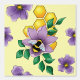 A cute bumblebee gently sits among two delicate lavender flowers and fresh green leaves, all set against a soft creamy yellow backdrop with yellow honeycomb design