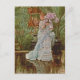 Victorian woman in flowing lavender dress holding bouquet of lilacs. Setting is in a conservatory. Fine art by French painter James Tissot.