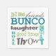 Fun party accessory for your next Bunco girls night out or fundraiser, Modern typography of words common to Bunco players. Dice, friends, bunco, laughter, roll good times, chat and throw.