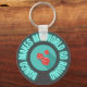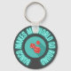 Those that love the game of Bunco will love this retro inspired keychain design with red dice on a turquoise centre, neon aqua "Bunco makes my world go round" text on dark chalkboard grey background.