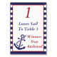 Hoist the sails it's time to play Bunco. Nautical themed Bunco table card includes an anchor and red, white and blue colour theme. You can change the text to make Bunco table cards from 1 to 100! Ship ahoy Matey! Bunco table cards are a great way to help other Bunco players transition from table to table. Table card can be used for weddings, anniversaries, birthdays, charity events, fundraisers, auctions and other festivities with a ship or nautical theme.