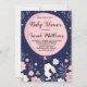 Navy & pink rabbit theme baby shower invitation featuring a cute white bunny holding a pink balloon surrounded by pink and white flowers and gold confetti.