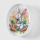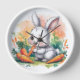 A delightful digital watercolor illustration of a fluffy white baby bunny enjoying a juicy carrot in a vibrant carrot patch. The soft pastel orange gradient background, adorned with subtle carrot patterns, creates a warm and inviting atmosphere. The bunny's happy expression and the overall sweet style make this a truly endearing piece.