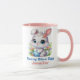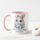 Adorable drawing of a white bunny with big blue eyes holding a blue Easter egg. The message "Bunny Blue Egg" is written in matching blue typeface under the image, and [NAME HERE] is written in matching pink under that. You can customise either or both messages to suit your taste. Available in multiple cup sizes and styles. You can also change the handle and/or inside mug colour.