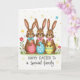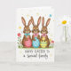 Designed with three brown, rabbit-like characters lined up across the center, this card shows them leaning close with gentle smiles and wide, friendly eyes 🐰. Each one wears a neat bow at the neck—blue on the left, and soft pink on the middle and right—adding a coordinated, affectionate touch like close friends dressed for the same outing. In their arms, they cradle large decorated eggs as if sharing a careful, sweet secret together. The left egg is pink with white polka dots, the middle egg is light blue with white stars, and the right egg is yellow with green stripes, creating a soft spring palette. Beneath the trio, a short message sits centered in a simple style, set in a medium-dark tone that stands out clearly against the white space. A low green strip grounds the scene, dotted with small red and yellow flowers 🌷 that feel like a tiny meadow at their feet. Around them, a few golden specks and thin outline butterflies float across the white background, with the butterflies drifting near the upper edges.