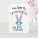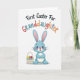 This card features a gentle digital illustration of an upright bunny in soft periwinkle blue, with pink inner ears, rosy cheeks, and a small smile that feels like it’s meant for someone close 🐰. Its paws are neatly clasped at the center, giving it a shy, affectionate posture, as if it’s posing for a loved one. To the bunny’s left sits a small, pale woven basket filled with brightly colored eggs in red, green, gold, and purple, some with light stripes for extra detail 🌷. Across the top, the words “First Easter For” appear in dark, flowing lettering, placed above the character with plenty of white space around it. Just below that, “Granddaughter” curves in an arc, with each letter in a different pastel shade like orange, green, blue, and red, each lightly outlined so it stands out. The background stays plain white, making the soft fur texture, shiny egg colors, and gentle facial expression easy to notice. The basket rests slightly forward of the bunny’s feet, and the eggs peek over the rim in a tidy cluster.