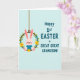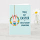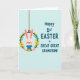 This card features a light pink bunny in a soft blue outfit, sitting cosily inside a green floral wreath with a gentle, affectionate look that feels like a family cuddle 🐰. The bunny’s long ears tilt slightly upward, with a tiny red nose and rosy cheeks that add a tender, friendly charm. The wreath is made from a brown vine ring and decorated with small yellow and pale blue flowers, tucked among leafy green sprigs like a springtime keepsake 🌷. A thin brown hanging cord at the top makes the wreath look suspended, as if it’s swaying lightly in the air. On the right side, teal lettering in large, easy-to-read capitals says “Happy 1st EASTER GREAT GREAT GRANDSON!” stacked across several lines. The text sits against a pale blue background with faint diagonal line texture, giving the layout a calm, airy feel beside the warmer pink and sunny yellow details. The bunny and wreath occupy the left half while the teal message fills the right, and the background remains softly patterned with diagonal stripes.