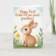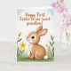 Designed with a gentle spring scene, this illustration features an upright, humanlike bunny as the main character, posed with a slight turn to the left as if noticing someone nearby 🐰. Its fur blends warm hazelnut and creamy ivory, with soft pink inside the long ears, a small pink nose, rosy cheeks, and a fluffy white tail. Large blue eyes catch the light, and the calm, tender look on its face adds a sweet, affectionate tone that suits close family or friendship. The background fades from pale blue into muted cream like an open sky, then settles into a grassy field of fresh green. Scattered across the grass are small yellow flowers and buds, adding a light springtime rhythm 🌷. Near the top, the greeting “Happy First Easter to our sweet grandson!” is centered in a warm-toned, flowing style of lettering that stands out clearly against the pale sky. Along the lower portion, the green grass forms a soft horizon line dotted with bright yellow blooms.