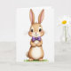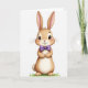This card features a friendly, upright bunny 🐰 centered on a white background, drawn with light brown fur and a creamy belly that feels soft to the eye. Its big dark eyes shine with tiny highlights, and the rosy cheeks and small pink nose give it a sweet, approachable look, like it’s meeting someone special. A wide smile shows two little front teeth, while the long ears rise up with pale pink inner fur, adding an attentive, affectionate pose. The front paws are held together neatly, suggesting shy excitement, as if it’s waiting to greet a close friend. A rich purple bow tie sits at the neck, adding a dressed-up touch that hints at a date or a warm get-together. Near the lower area, a short line of greeting text appears in a soft purple tone, positioned just above a few scattered green grass blades 🌷. The grass sits along the bottom edge in small emerald strokes beneath the bunny’s feet.