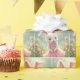 A cute white bunny dressed in pink stands among blooming flowers, looking delighted with its ears perked up